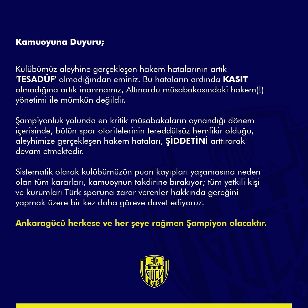 Ankaragücü Kulübü, Altınordu maçının hemen ardından bir açıklama yaptı.