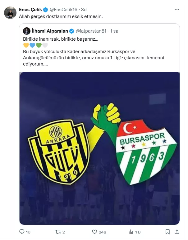 Enes Çelik, MKE Ankaragücü Başkanı İlhami Alparslan'ın Bursaspor ile ilgili yaptığı dikkat çeken paylaşımı sosyal medyada tekrar paylaşarak teşekkür etti.