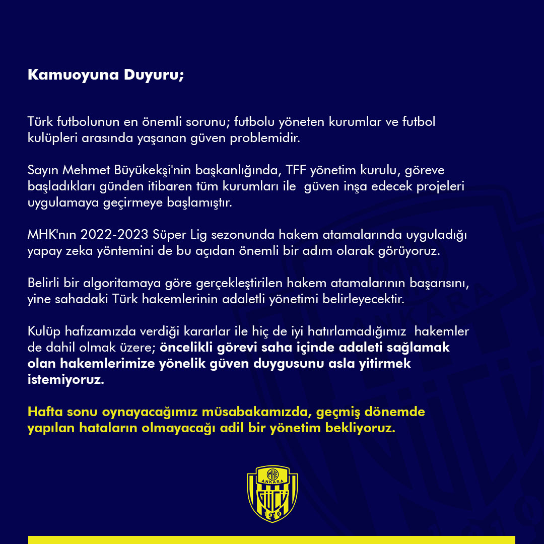 Ankaragücü Kulübü'de hakem için bir açıklama yayınladı. Açıklamada şu ifadeler yer aldı: