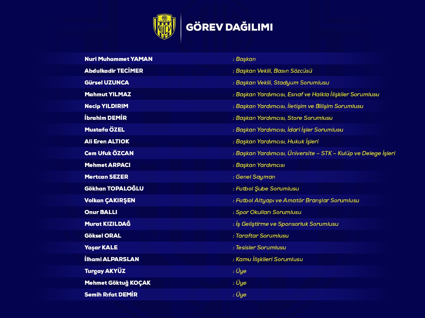 MKE Ankaragücü Yönetim Kurulu görev dağılımını açıkladı.