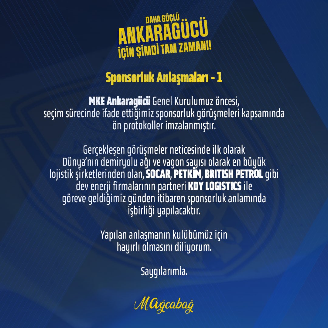 MKE Ankaragücü Genel Kurulumuz öncesi, seçim sürecinde ifade ettiğimiz sponsorluk görüşmeleri kapsamında ön protokoller imzalanmıştır. Gerçekleşen görüşmeler neticesinde ilk olarak Dünya’nın demiryolu ağı ve vagon sayısı olarak en büyük lojistik şirketlerinden olan, SOCAR, PETKİM, BRITISH PETROL gibi dev enerji firmalarının partneri KDY LOGISTICS ile göreve geldiğimiz günden itibaren sponsporluk anlamında işbirliği yapılacaktır. Yapılan anlaşmanın kulübümüz için hayırlı olmasını diliyorum. Saygılarımla"